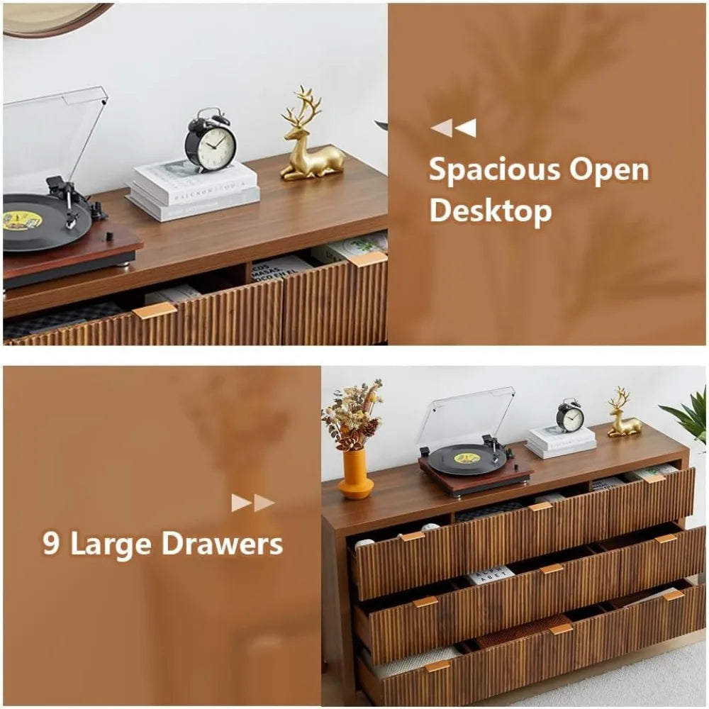 • 【Large Storage Space】The wood dresser has 9 large drawers, which provide ample space for your daily storage. Large storage space design, it can accommodate toys, daily necessities, magazines, and so on. And an open platform on top of the table, you can put vases, photo albums, water cups and other decorations on it, and store other personal items in the drawer for easy storage next time. This drawer dresser is a perfect storage solution for various occasions, such as bedroom, nursery room.